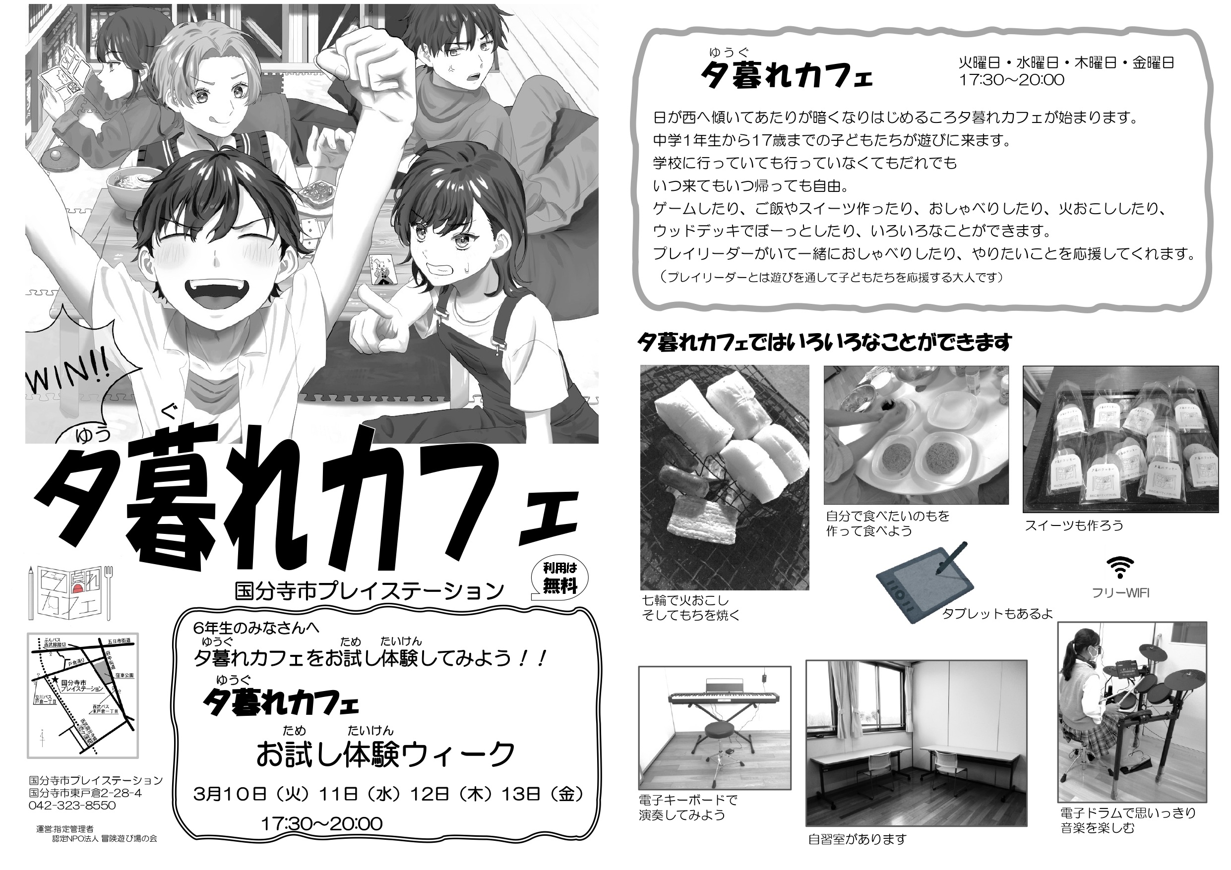 - 国分寺市プレイステーションにて「夕暮れカフェお試しウィーク」を開催します。小学6年生が体験できます。、直接プレイステーションに来てください。<<詳しくはこちら