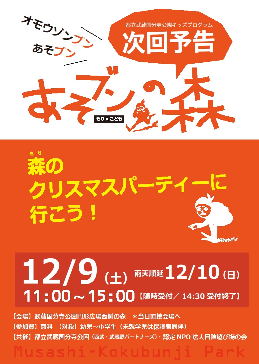 平成28年3月5日(土)11:00~15:00(受付14:30まで)、都立武蔵国分寺公園にて、あそブンの森「森の忍者修行!4つの修行に挑戦しよう!」を開催します。忍者に変身して、森の中に設けられた修行をクリアしていこう☆当日直接会場へ。対象:幼児~小学生(未就園児は保護者同伴のこと)。無料。雨天の場合は6日(日)に順延します。公園管理者の「西武・武蔵野パートナーズ」との共催事業です。